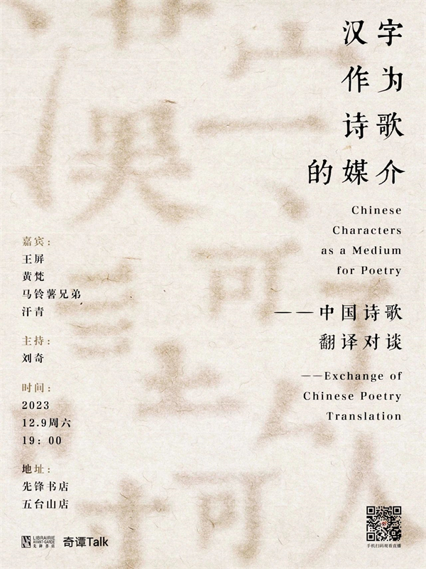 汉语是最适合诗歌的,因为它由意象和声象组成,是世界上唯一的表意又表音的文字,又是世上唯一不受时空限制的文字,可拆开重新组装,如同Lego。维持中国文明的土壤是汉字,延续保持汉字生命力的血液是诗歌,中国诗歌在世界的翻译与传播显得尤为重要,起初关于中国古典诗歌的译作颇多。中国新诗的译介起步虽晚,但发展迅速。著有《我的名字叫移民》《三文鱼王之歌》等诗集的诗人、译者王屏,其编译的《新一代:中国当下诗选》,重点关注朦胧诗之后出现的新一代诗人的作品,推动了中国当代诗歌译介的浪潮。12月9日,我们邀请诗人、译者、美国麦克乐思特大学终身教授王屏做客南京先锋书店五台山总店,并邀请诗人、小说家黄梵,诗人、图书策划人马铃薯兄弟,诗人汗青作为对谈嘉宾,青年作家刘奇主持,与大家聊聊中国诗歌翻译的滥觞、发展和变化,以及中国诗歌的特点如何通过翻译影响世界。