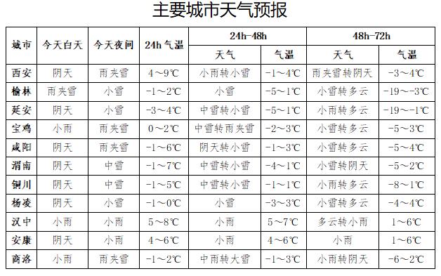 预计关中北部、秦岭山区有冻雨、大到暴雪、局地大暴雪,陕南东部有中到大雨、局地暴雨并伴有雷电等极端天气,陕西中北部降温12~16℃、陕北最低温度可达-28℃。