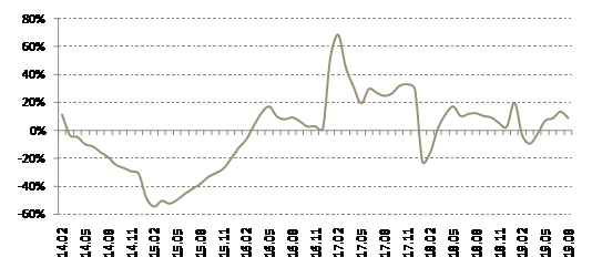 报告显示,2019年1-8月份,重点监测的全国100个城市宅地成交面积为39388万平方米,同比增长9.2%。该增速相比1-7月份13.8%的数值有明显收窄。观察宅地的历史交易走势,可以看出,2016年第四季度房地产政策开始收紧,滞后一个季度后即2017年第一季度,宅地市场基本面也发生了变化。从2017年开始,撇去部分交易结构干扰和季节性异动等因素,大趋势看,宅地交易市场以降温为主要特征。