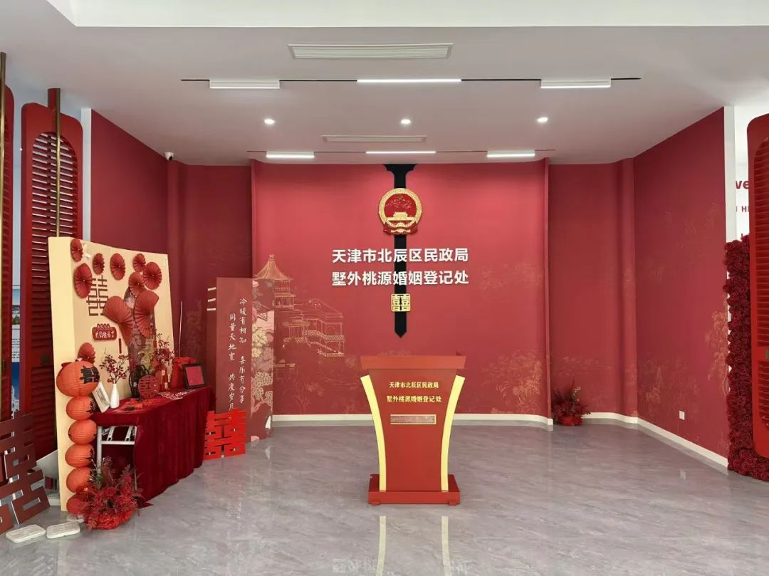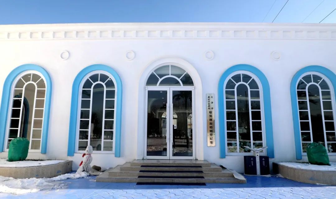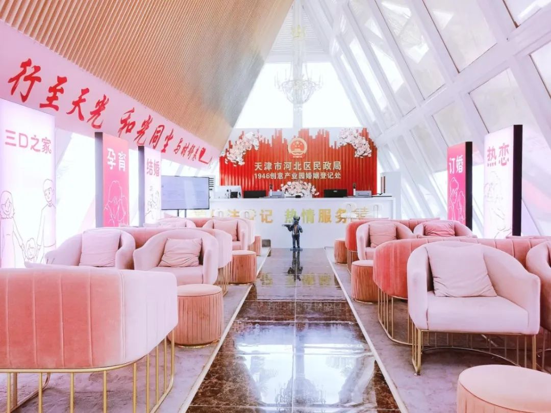 特点:登记处为新人营造“中西合璧,古今交融”的婚姻文化氛围,场景化的结婚登记仪式提升了新人对幸福生活的期待值和责任感,使婚姻的缔结更加浪漫与庄重,真正实现了从“办公程序化”到“文旅新场景”的转变。打造婚姻登记与优美景区完美融合的“新地标”,擦亮“海河之滨,爱在河北”婚俗文化新品牌。