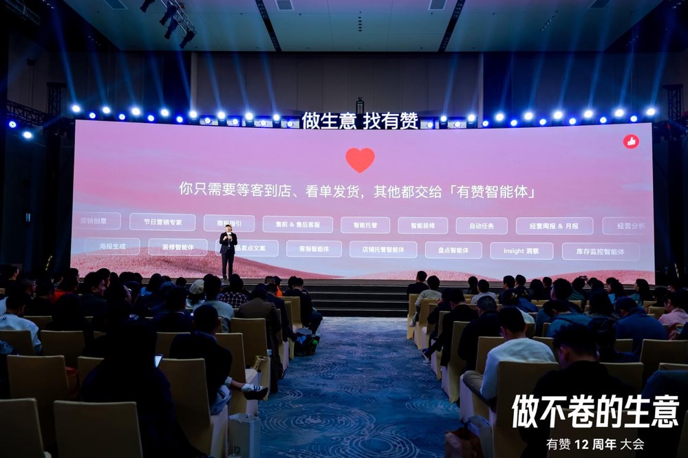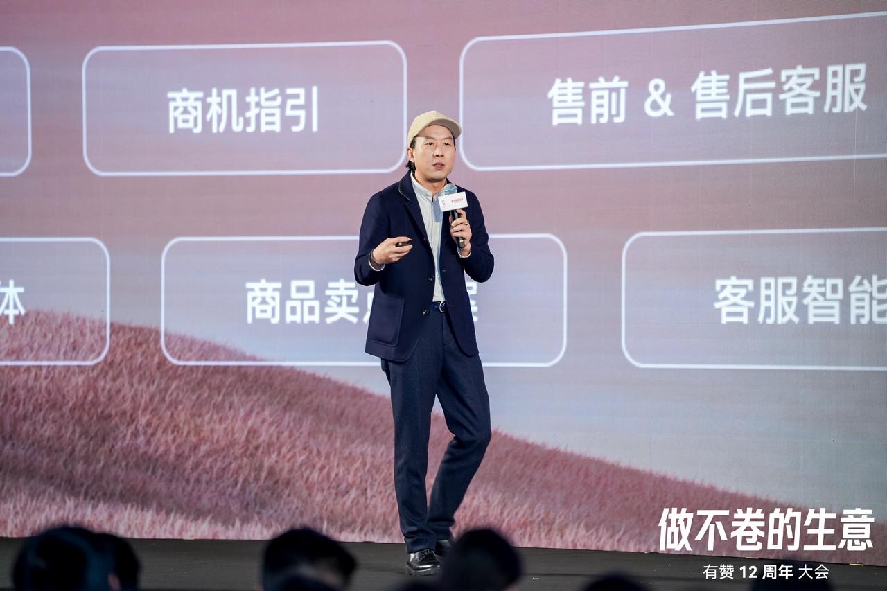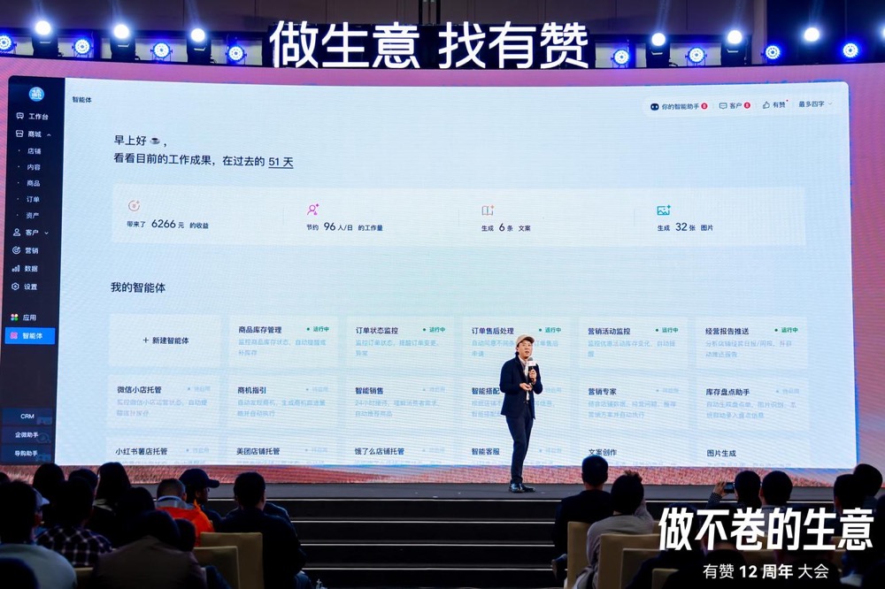 有赞 12 周年发布会,主题是「做不卷的生意」,有赞 CEO 白鸦(朱宁)这样表述他对「不卷」的理解——不累着就可以做大销售额,「你只需要等客到店、看单发货」。