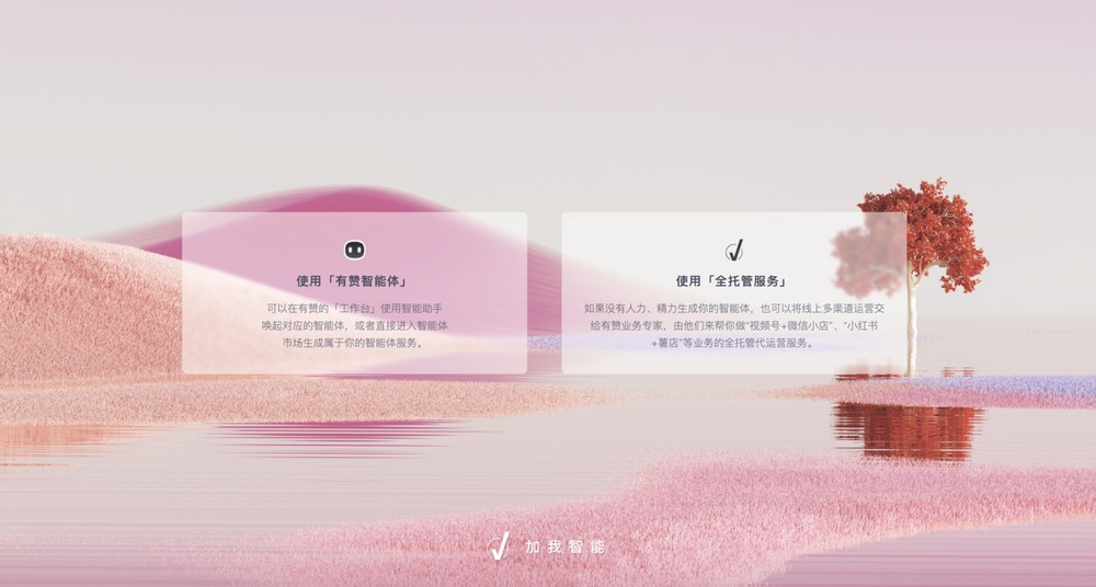 而且我觉得这里不只是 AI,更多的是智能化工具和数字化工具的作用。举一个特别小的例子,有赞「加我智能」官网上有两个入口,一个入口是去有赞的工作台找智能体用,右边还有一个入口,是客户报名申请全托管(代运营)用的。