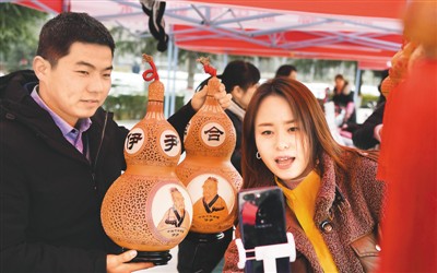 近年来,陕西省渭南市合阳县将电子商务作为县域经济转型的新动力,先后举办电商欢乐购物节、电商农产品展销会等系列活动。图为电商平台工作人员在合阳县“电商赶大集”活动现场直播推广葫芦灯。