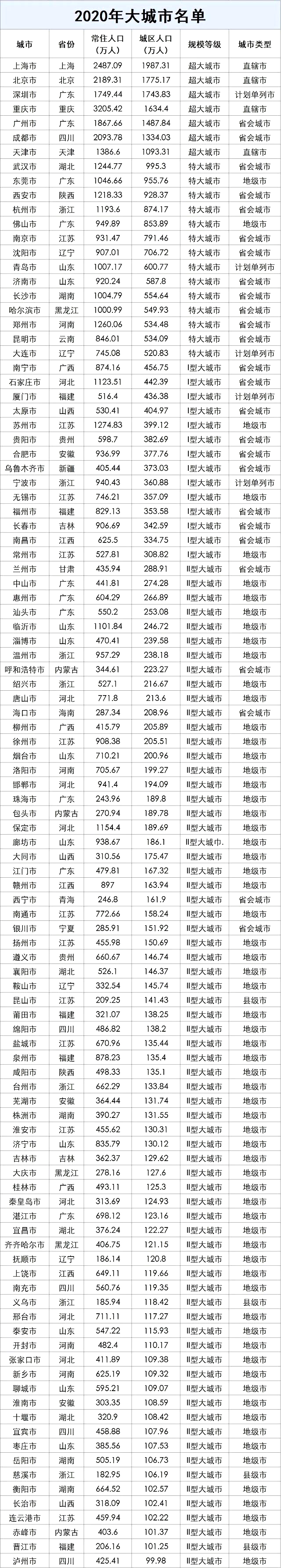 或许,这就是为什么很多人都向往大城市的原因。近日,国务院第七次全国人口普查领导小组办公室编制的《2020中国人口普查分县资料》显示,目前我国共有105个大城市,包括7个超大城市、14个特大城市、14个Ⅰ型大城市以及70个Ⅱ型大城市。