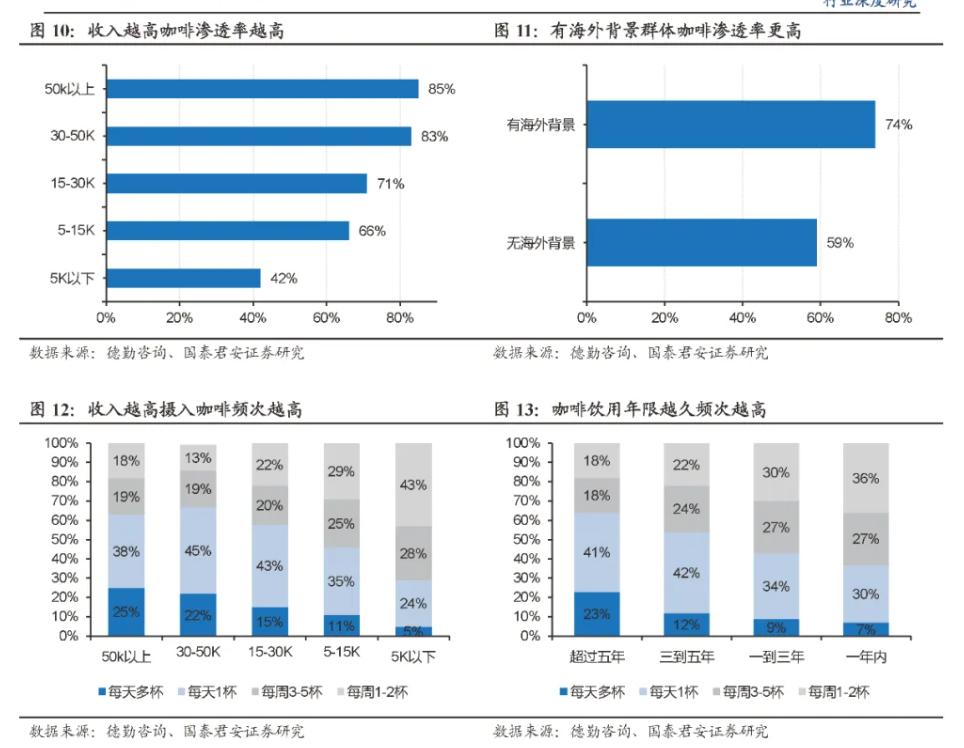 可以预见,下沉市场免不了一轮新的价格战,并且难度比一线城市大不少——收入越高,咖啡渗透率越高,摄入咖啡频次越高,应用年限越久····