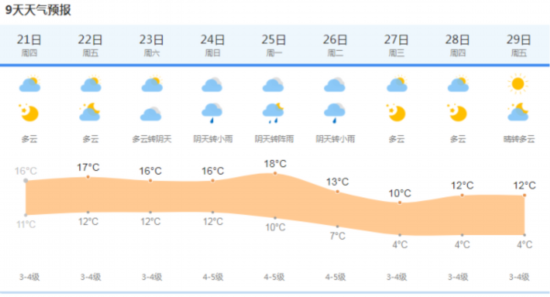 多云的天气一直将持续到周六,受短波槽影响,周日白天云系增多,夜间至下周初将有一次降水天气过程,气温起伏不大,总体在11~18℃。下周二前后受冷空气影响,雨渐止转阴到多云天气,气温将进一步下降,下周中后期最低气温会降至个位数,带来冬日体感。