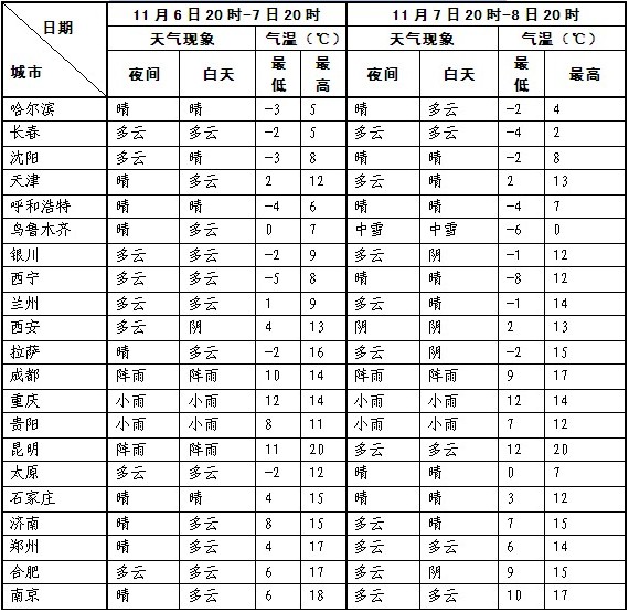 预计7日至8日,弱冷空气影响北方地区;8日至11日,受新一股较强冷空气影响,北方大部地区降温4~8℃,局地可达10~12℃;北方大部并伴有4~6级偏北风,新疆山口风力可达8~9级。同时,7日至8日,新疆北部有小到中雪或雨夹雪,其中,塔城、阿勒泰和天山地区西部等地的部分地区有大到暴雪。