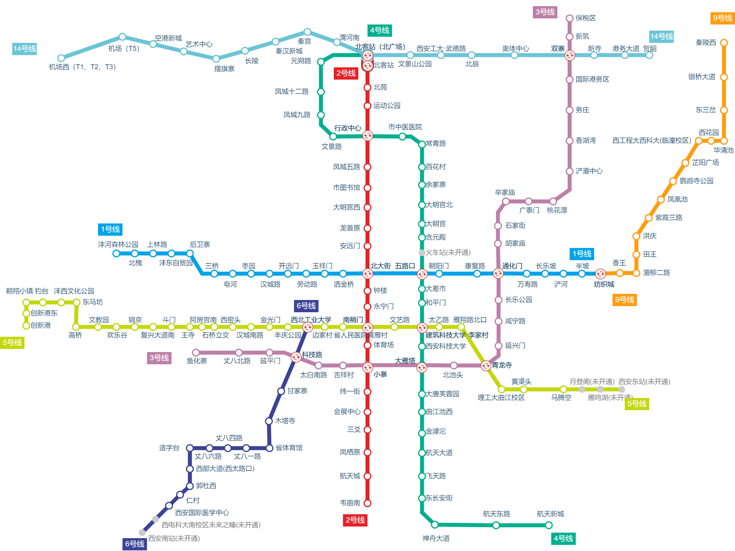 西安地铁共8条线,分别为1号线、2号线、3号线、4号线、5号线、6号线、9号线、14号线,下面就是小编整理的西安地铁线路图,高清版可放大最新版,附带各个地铁线路首末班车时间。