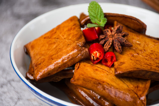 大通茶干是安徽铜陵大通镇地方传统名菜,形方如牌、体薄如纸,色艳味浓,鲜美耐嚼,饮茶待客馈亲赠友皆宜。大通茶干采用铜陵县汀洲盛产的大豆为主要原料,经过淘洗、磨浆、煮浆、点卤、裹压等30多道工序精制而成,这样生产的大通茶干的特点是色艳味浓、鲜美耐嚼。据了解,大通茶干品种有火腿、蒲包、十香、双味等10多个品种,受到很多民众的喜爱。 【 详细>>】