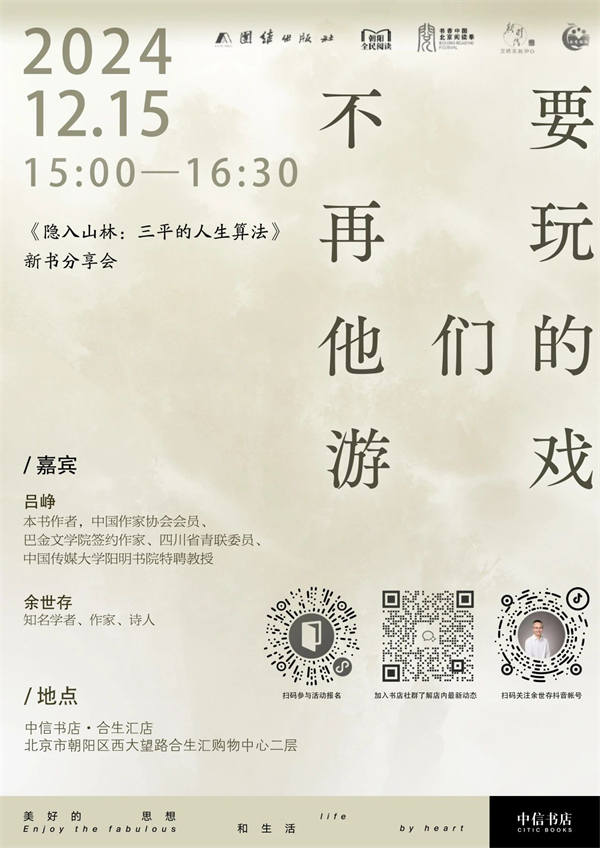 《隐入山林:三平的人生算法》是著名作家吕峥继《明朝一哥王阳明》与《怪圈:政治周期与明末困局》等畅销书后推出的最新力作。以唐代三平祖师(784-872)的生平为线索,将禅宗、老庄和儒家的思想精髓与现代哲学相结合,以举重若轻、深入浅出的文字娓娓道来,帮读者探寻生命的真相与幸福的真谛。12月15日,我们邀请到了吕峥和知名学者、诗人余世存先生,做客中信书店·合生汇店,与大家共同分享中国传统哲学中对如何过好这一生的独特思考,邀您一起体验幸福人生。