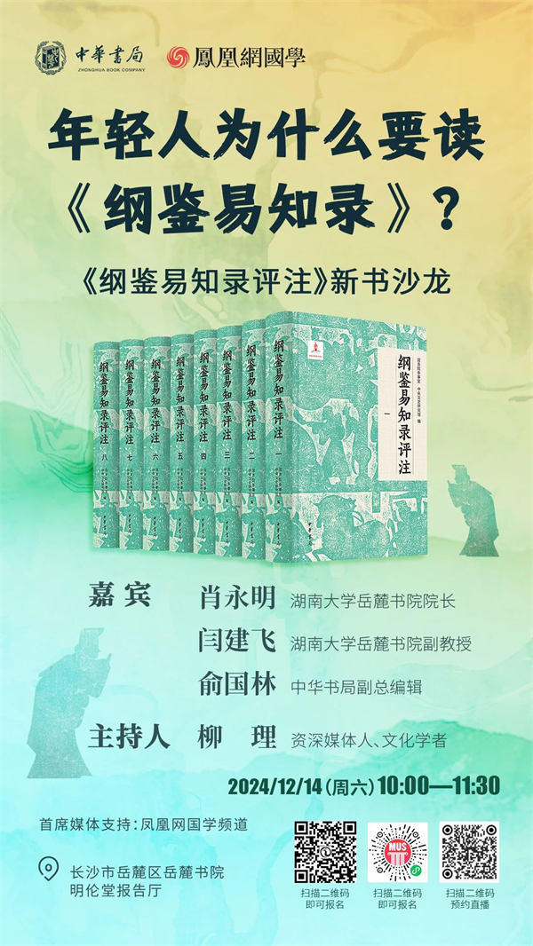 当下的年轻读者可以从《纲鉴易知录评注》中获得什么?在编纂和出版过程中,学者们和编辑们是如何对书稿进行校正和优化的?应当用什么方法来阅读这部书?12月14日,我们将在岳麓书院明伦堂报告厅举办《纲鉴易知录评注》新书沙龙,邀请湖南大学岳麓书院院长肖永明、中华书局副总编辑俞国林、岳麓书院副教授闫建飞,就以上话题与广大读者分享。