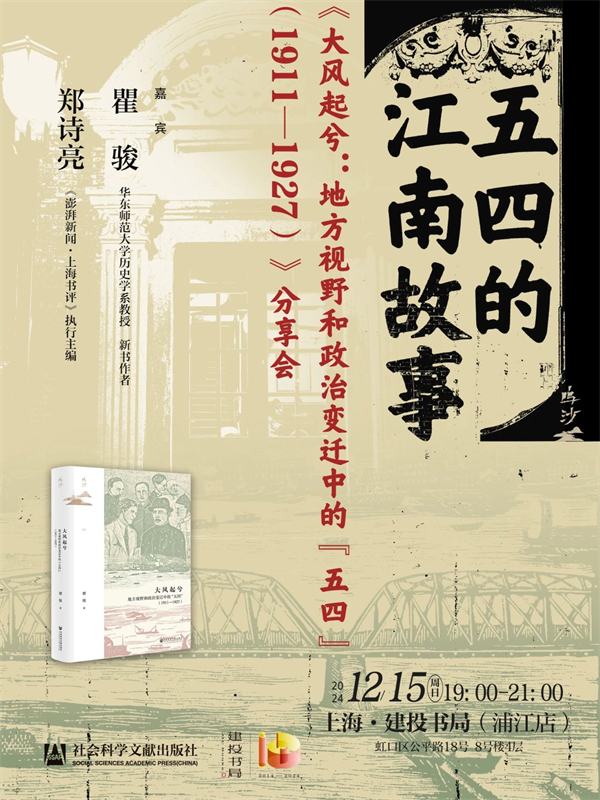 五四大风何以能蔓延到各个地方?又如何与地方读书人互动?各个地方的读书人是否有不同的感受与应对?身处“中心”的巨型知识分子有可能被地方读书人影响、调动吗?瞿骏教授新著《大风起兮:地方视野和政治变迁中的“五四”(1911-1927)》,尝试从“地方视野”出发,展示中国各区域,尤其是江浙地方上五四运动发生、拓展、延续的机制,尝试对这些问题作回答。12月15日,值此新书出版之际,我们邀请《澎湃新闻·上海书评》执行主编郑诗亮先生与作者瞿骏老师一起,共谈“五四的江南故事”。