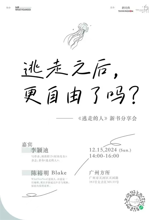 这是一次漫长的旅途,闯进被雪封闭的城市,走入陌生人紧闭的家,也试图探索我们这一代疲倦但仍拥有微小勇气的心灵:说到底,如何才能得到自由呢?自由又将带我们通向何方?12月15日,李颖迪将携新书《逃走的人》来到广州方所,与WhatYouNeed创始人陈裕明Blake共同探讨逃走的生活方式,与读者朋友们一起聊聊:逃走之后,会让人更自由吗?