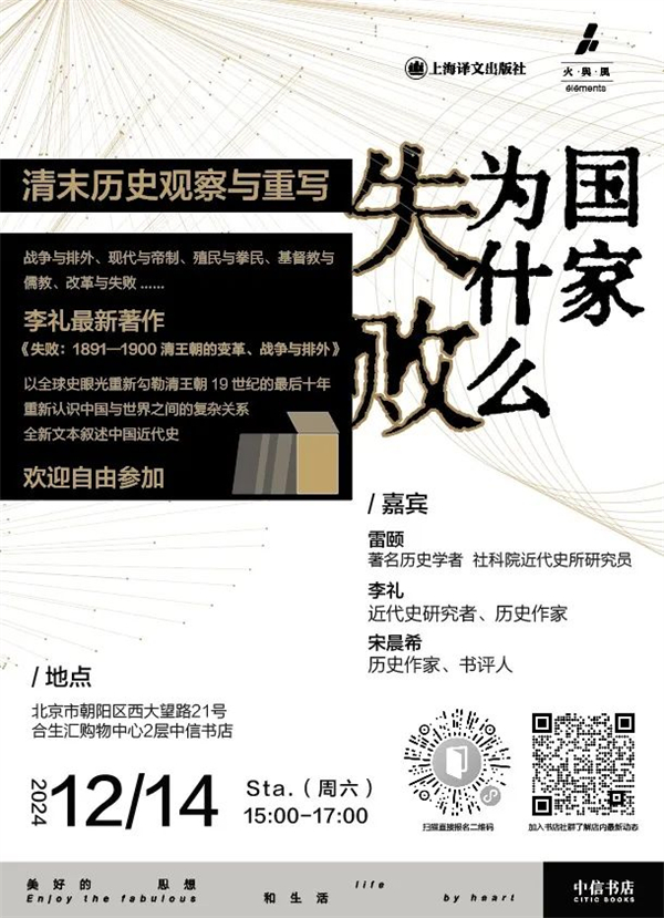 19世纪末,清帝国在内忧外患中挣扎求存,从甲午战争的惨败到戊戌变法的屡次失败,再到义和团运动的爆发,经历改革尝试、外交失败、内乱频发,帝国的自我救赎之路无比坎坷,最终未能摆脱衰亡命运。李礼的《失败:1891-1900清王朝的变革、战争与排外》,以全球史的眼光回望这一历史节点,走进那段动荡不安的历史岁月,重构清朝末期的历史图景。12月14日,我们邀请著名历史学者雷颐和李礼深入探讨清末历史的关键事件与转折,讨论清朝的衰败原因及其对当代的启示。