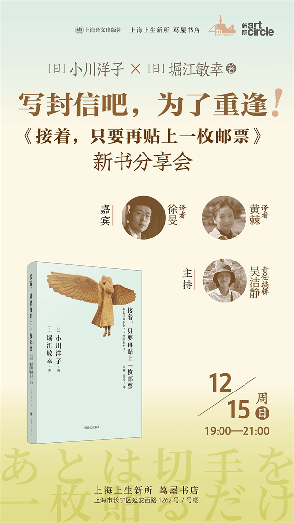 你还记得等待一封信的感觉吗?2022年,以“信”为媒介,日本小说家小川洋子与堀江敏幸,在同一时间开始了一场毫无商议,纯属偶然的联手创作。以“通信”的形式,来联合创作一本小说,最终结果为《接着,只要再贴上一枚邮票》这本书,由两位作家各自虚构的角色的十四封通信组成。12月15日,欢迎你也带着你最想写却仍未写过的那封信,或者曾经通信的心情,来到上生新所茑屋书店,和《接着,只要再贴上一枚邮票》的译者、责编,一起重逢在通信中。