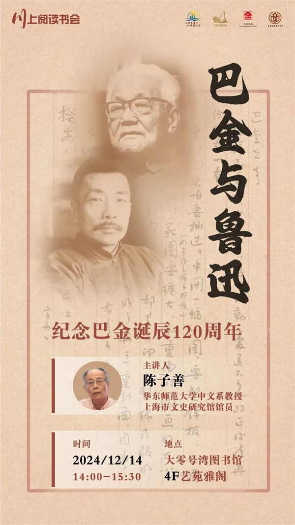 在20世纪中国文学史上,鲁迅与巴金是两个伟大的存在。巴金1926年读到鲁迅的《呐喊》后,“就一直没有离开过《呐喊》”,视鲁迅为精神导师,一直以他为师从事文学创作。他们的合作始于1931年,巴金所编的爱罗先珂小说散文集《幸福的船》中收录了鲁迅所译的四篇作品。他们于1933年首次见面。巴金创办文化生活出版社后,他们的合作进一步加强,巴金出版了鲁迅最后一部小说集《故事新编》。12月14日,华东师范大学中文系教授、上海市文史研究馆馆员陈子善将来到大零号湾图书馆,带来“巴金与鲁迅:纪念巴金诞辰120周年”主题讲座,带领大家一起回顾巴金与鲁迅的交往史和给我们的启示。