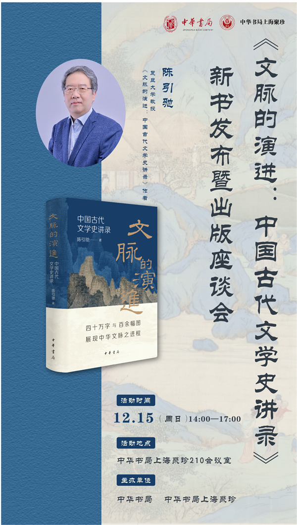 陈引驰教授自1995年起,在复旦大学开设“中国古代文学史”课程,经三十年沉淀,首次将课程讲录整理出版。本书以中西比较大视野进行观察,纵向上以时间为线索,横向上以文类为划分,交织成动态演进的中国文学史网络,且融汇古今中外卓识,独创新见,是以当代学人的担当赓续中华文脉的力作。12月15日,在中华书局上海聚珍210会议室,将举办陈引驰教授《文脉的演进:中国古代文学史讲录》新书发布暨出版座谈会。