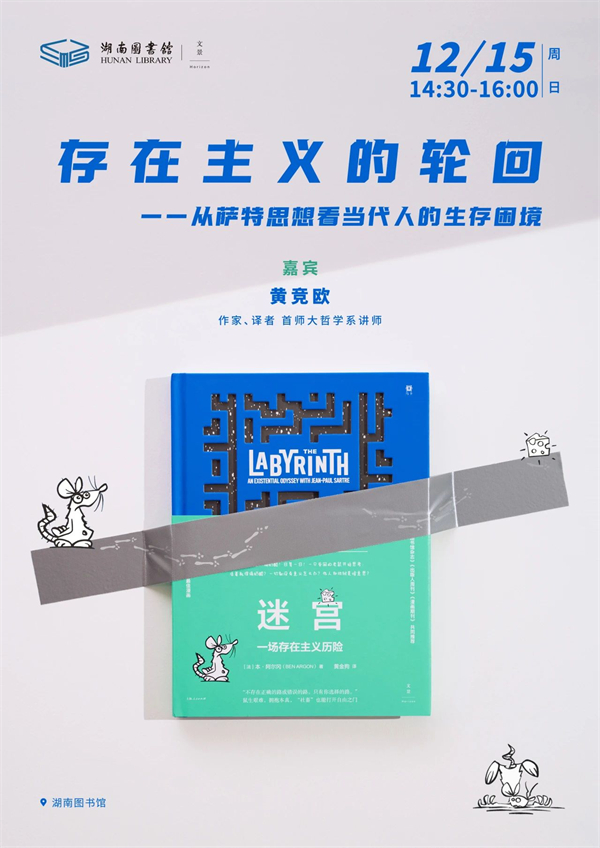 《迷宫:一场存在主义历险》是一部幽默且深刻的哲学漫画作品,以一只喜欢奶酪的老鼠困在迷宫里的视角,通俗地阐释了存在主义哲学家让-保罗·萨特的重要思想,尤其是《存在与虚无》中的重要思想,比如何为“存在决定本质”,何为自由、责任,何为人生的意义等话题。12月14日,我们邀请首师大哲学系讲师兼本书译者黄竞欧以及文化活动策划人、主持人籽衡,一起聊聊我们该如何阅读这部作品,从中能够获得怎样的启发。