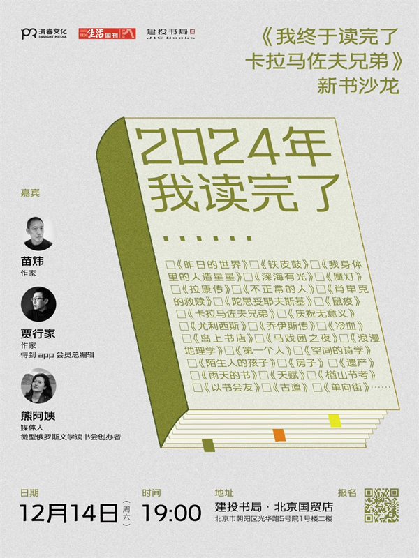 翻翻朋友圈,回顾自己去了哪些城市旅行,留下什么精彩瞬间;数数票根,回忆和朋友参加了哪些演出,感动或是失望;等各大APP的年终总结,惊叹自己听过哪些小众歌曲、花了哪些冤枉钱、深夜3点竟然点了外卖……又或者,点开“已读”,发现2024年,我终于读完了这一本大部头!苗炜的新书《我终于读完了卡拉马佐夫兄弟》就是这样一本汇集了各种“终于读完了”的心情的“文学体验”之书。12月14日,年末已至,浦睿文化、行读沙龙联合建投书局,邀请到苗炜、贾行家以及熊阿姨,一起聊聊今年读过的好书,以及阅读带给自己的多样丰富体验。