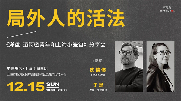 12月15日晚,《洋盘》的作者沈恺伟、文学翻译家于是将做客中信书店,探讨都市青年共同的“局外人”生存体验。在这里,你将听到不一样的上海故事,感受“局外人”在这座城市里的生命律动,一同思索在多元世界中如何找寻自我存在的价值与意义。