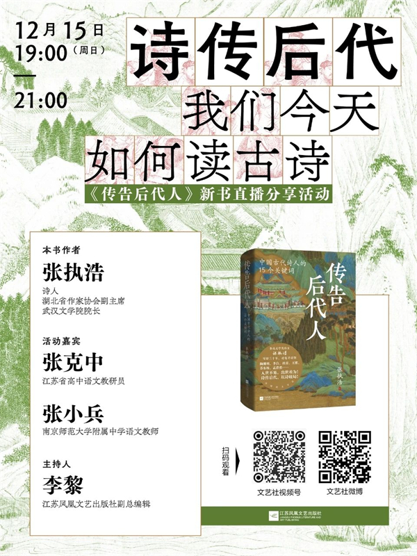 《传告后代人:中国古代诗人的15个关键词》讲述了中国人的诗学生命源头、东方诗意生活的缘起。12月15日,本书作者、鲁迅文学奖得主张执浩,江苏省教育科学研究院中小学教学研究室高中语文教研员张克中,南京师范大学附属中学树人学校党委书记张小兵,江苏凤凰文艺出版社副总编辑李黎一起,做客直播间,从中国古典诗词出发,聊一聊今天的我们应该如何读古诗,古诗、古典诗人都带给了我们什么。