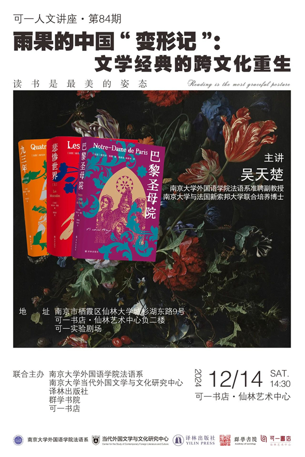 雨果的作品如何跨越时空,来到中国?中国的译者从何时开始,又是通过何种渠道将雨果及其作品介绍给中国读者?在不同时期,我们如何解读甚至改编雨果的作品?本场讲座,吴天楚老师将通过精心挑选的雨果作品名家译本,带你深入体验这位文学巨匠的思想和艺术,通过丰富的史料与生动的案例,揭秘这位法国文豪在中国的“变形”之旅,探索他的作品如何与中国本土语境发生复杂深入的互动,成为家喻户晓的经典。