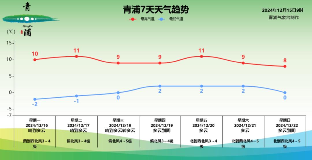 下周青浦区的天气格局依旧是晴冷。周一早间受辐射降温影响,气温较低,零下2℃左右。白天开始气温略有回升,预计下周工作日的最高气温在10℃左右,周六前后受新一轮冷空气影响,青浦区的气温又将回落至个位数。