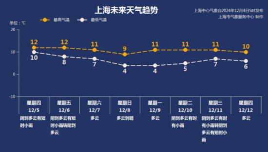 周四和周五白天,上海都是阴到多云有短时小雨的天气,雨水并不明显,但气温会进一步下降,这两天的气温总体保持在8~12℃之间,体感阴冷。真正的冷空气降温将会出现在双休日。受冷空气影响,双休日和下周初上海天气转好,风力增大,气温下降。其中,周日最冷,全天气温跌至个位数,在4~9℃之间。由于不断有冷空气补充影响,下周总体升温力度不大,最高气温不超过12℃。初冬的寒意显现,需要做好防寒保暖工作。