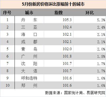 新房价格环比上涨最快的丹东,涨幅达5.3%,三亚、成都、海口、青岛超过2%。而在3、4月份,新房环比最高涨幅分别仅为2.1%、2%,且仅有一个城市。