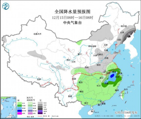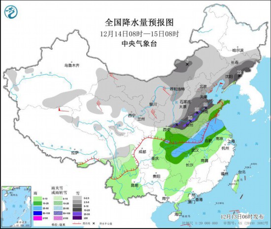 12月13日至15日,中东部地区将出现一次大范围雨雪天气过程,新疆北部、西北地区东部、内蒙古、华北、黄淮中北部、东北地区中南部及青藏高原中东部有小到中雪,其中陕南、华北、黄淮北部、东北地区南部和东部等地的部分地区有大到暴雪,局地大暴雪;黄淮中南部、江淮、江汉、重庆北部及江南等地有中到大雨,局地暴雨。