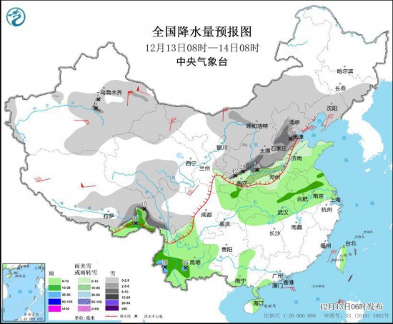 12月13日08时至14日08时,新疆中东部、内蒙古大部、西北地区南部和东部、华北、东北地区中南部、黄淮北部、西藏东部、川西高原中北部等地部分地区有小到中雪或雨夹雪,其中,陕西中部、山西南部、河北南部、北京南部、河南北部和西部等地部分地区有大到暴雪,其中,陕西中部等地部分地区有大暴雪(20~25毫米)。西藏东南部、西南地区南部和西部、黄淮中南部、江淮、江汉、江南北部、海南岛东部、台湾岛东部等地部分地区有小到中雨,其中,云南西南部和中部、西藏东南部等地局地有大雨(25~35毫米)。内蒙古西北部、辽东半岛、新疆南疆盆地和东部、西藏北部和西部、甘肃河西、川西高原北部等地部分地区有4~6级风,其中,西藏西部、川西高原北部等地部分地区有6~7级风,新疆东部部分地区有8~9级风。