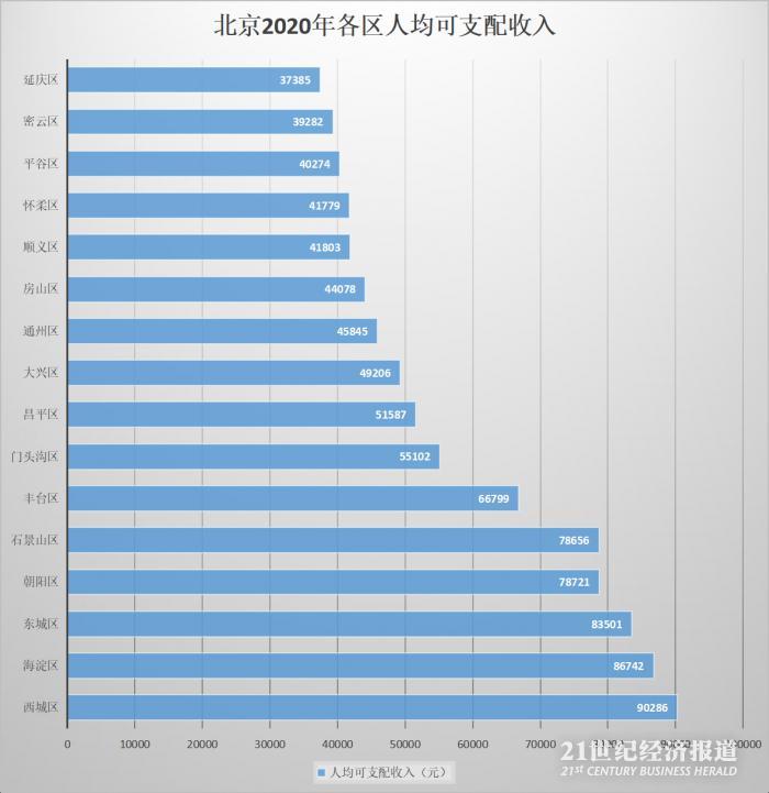 从数据来看,2021年上半年,一线城市的人均可支配收入在各个城市中名列前茅。但是,从一线城市各区的情况来看,差别非常大。21世纪经济报道记者统计后发现,2020年,北京西城区、上海黄浦区的人均可支配收入分别达到90286元、88280元,排名一线城市各区的人均可支配收入第一和第二位。