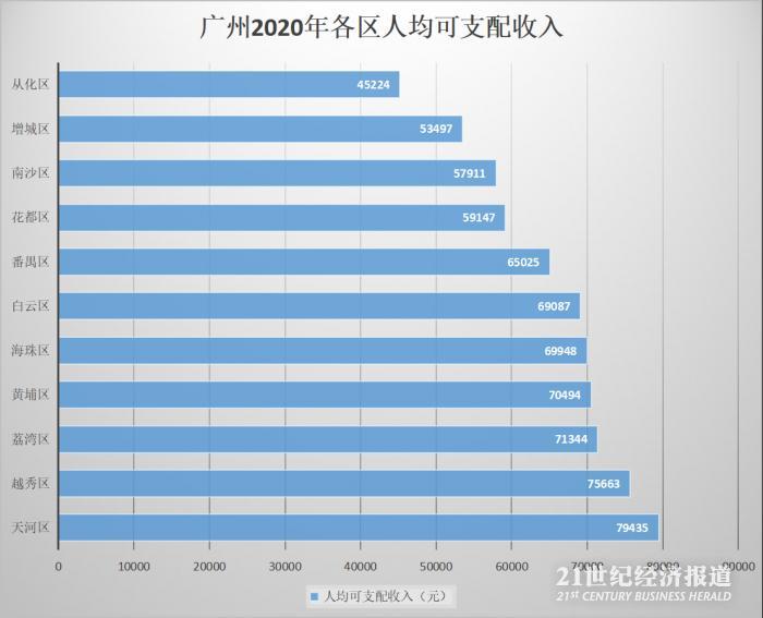 深圳2020年人均可支配收入最高的为福田区,达到84473.36元;南山区排名第二,为79302.31元。不过大鹏新区的人均可支配收入在2020年为44032元。广州2020年人均可支配收入最高的区为天河区,达到79435元。越秀区、荔湾区和黄埔区的人均可支配收入也超过7万元。不过,从化区的人均可支配收入为45224元。
