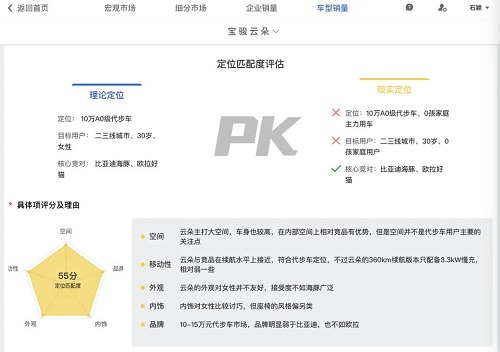 云朵官方定位在10-15万区间的年轻家庭主力用车,但实际上,云朵是一款A0级的纯电车,小空间和低续航的纯电车型无法满足家庭主力用车的功能需求,产品和目标市场的主力人群需求出现了巨大Gap。