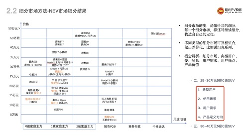 上图是我们的市场研究的基础框架,被划分出的每个Segment代表一个细分市场且具有显著的品类属性。“建约EV预测”系统上线了我们对每个细分市场的研究论点,包括:该细分市场的典型用户、使用场景、用户需求、产品定义方向等。
