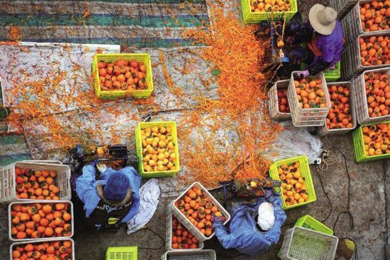 村民给柿子削皮。