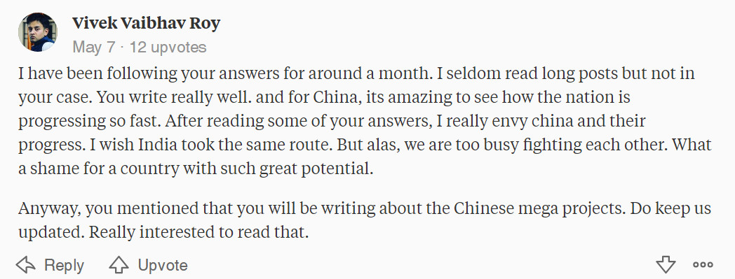 我已经关注你的答案大约一个月了。除了你的文章以外,我很少读长文章。你写得非常好。至于中国,看到这个国家发展得如此迅速,我十分惊讶。在读了你的一些回答之后,我十分羡慕中国和中国的进步。我希望印度也能走这条路。但很可惜,我们忙于内讧。对于一个拥有如此巨大潜力的国家来说,这是多么遗憾。