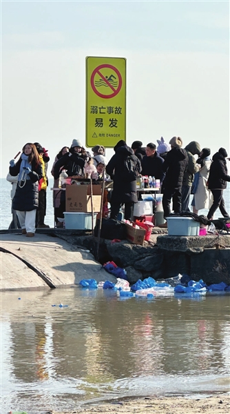 记者远距离观察,二百米左右的防波堤上大约站着三四百人,有些地方甚至站成两排。东疆亲海公园的北面时不时会有炮声,炮响起,海鸥从北面飞到南面,人群也跟着走,狭窄的防波堤显得十分拥挤。商贩告诉记者,放炮是为了驱赶海鸥,将海鸥驱赶到南面商贩多的地方,人也就跟着来了,商贩才有生意。人都随着海鸥来回走动,因此防波堤上的安全性几乎为零。