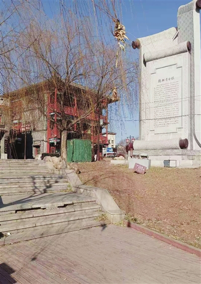同时,记者发现了一些问题。古镇内很多道路出现不同程度的破损,其中石家大院门前的道路坑洼最为严重。柳口路边的景区门前地面片片油污,最大的一片就在大运河边的游客进出口处。与古镇相连的大运河边公园景区,有一片用木条铺成的休闲区,上面还有很多用同样的木条制成的凳子,有些木条已经缺失、松动。还有的石头铺成的台阶处,大石松动,下面仅垫了两小块石片,一踩一晃荡,容易摔人。