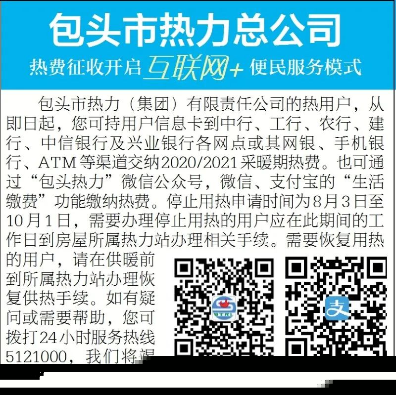 从8月7日起,您可持用户信息卡到指定银行各网点或其网银、手机银行、ATM等渠道交纳2020/2021采暖期热费。热费的指定代收机构为:中国银行、中国工商银行、中国农业银行、中国建设银行、中信银行及兴业银行。同时,热用户还可关注“包头热力”微信公众号,通过微信、支付宝进行缴费或通过微信、支付宝的“生活缴费”功能缴纳热费。