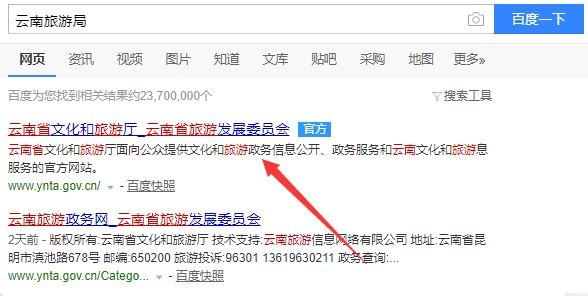 1、打开百度搜索,查询景区所在地旅游局信息,以云南省为例,点击进入云南省旅游局官方网站。