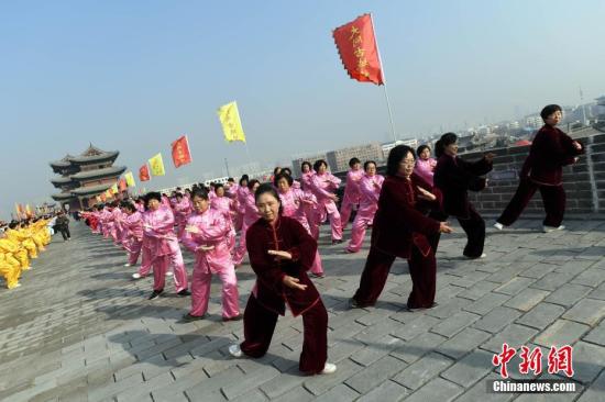 资料图:山西大同,民众在古城墙上表演太极拳。 中新社记者 武俊杰 摄
