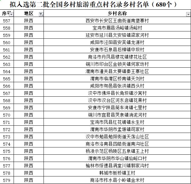 拟入选第二批全国乡村旅游重点村名录乡村名单共680个,陕西拟入选23个,具体名单如下: