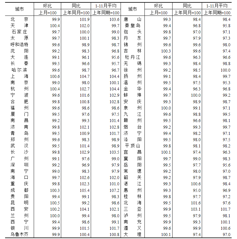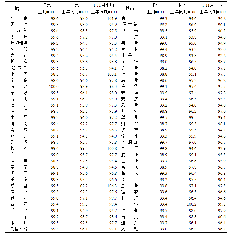 从环比看,11月份,一线城市新建商品住宅销售价格环比下降0.3%,降幅与上月相同,其中北京、广州和深圳环比分别下降0.1%、0.9%和0.8%,上海环比上涨0.6%。二线城市新建商品住宅销售价格环比下降0.3%,降幅比上月扩大0.1个百分点。三线城市新建商品住宅销售价格环比下降0.4%,降幅比上月收窄0.1个百分点。