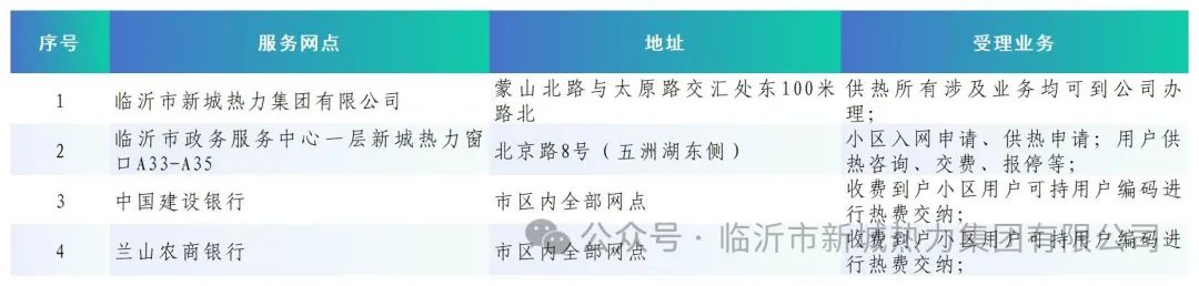 ②收费到户小区用户推荐使用微信、支付宝交费,或使用建设银行、农商银行的网上银行和手机银行交费;现场交费可至新城热力客服中心、临沂市政务服务中心新城热力交费窗口、建设银行代收点、农商银行代收点交费。