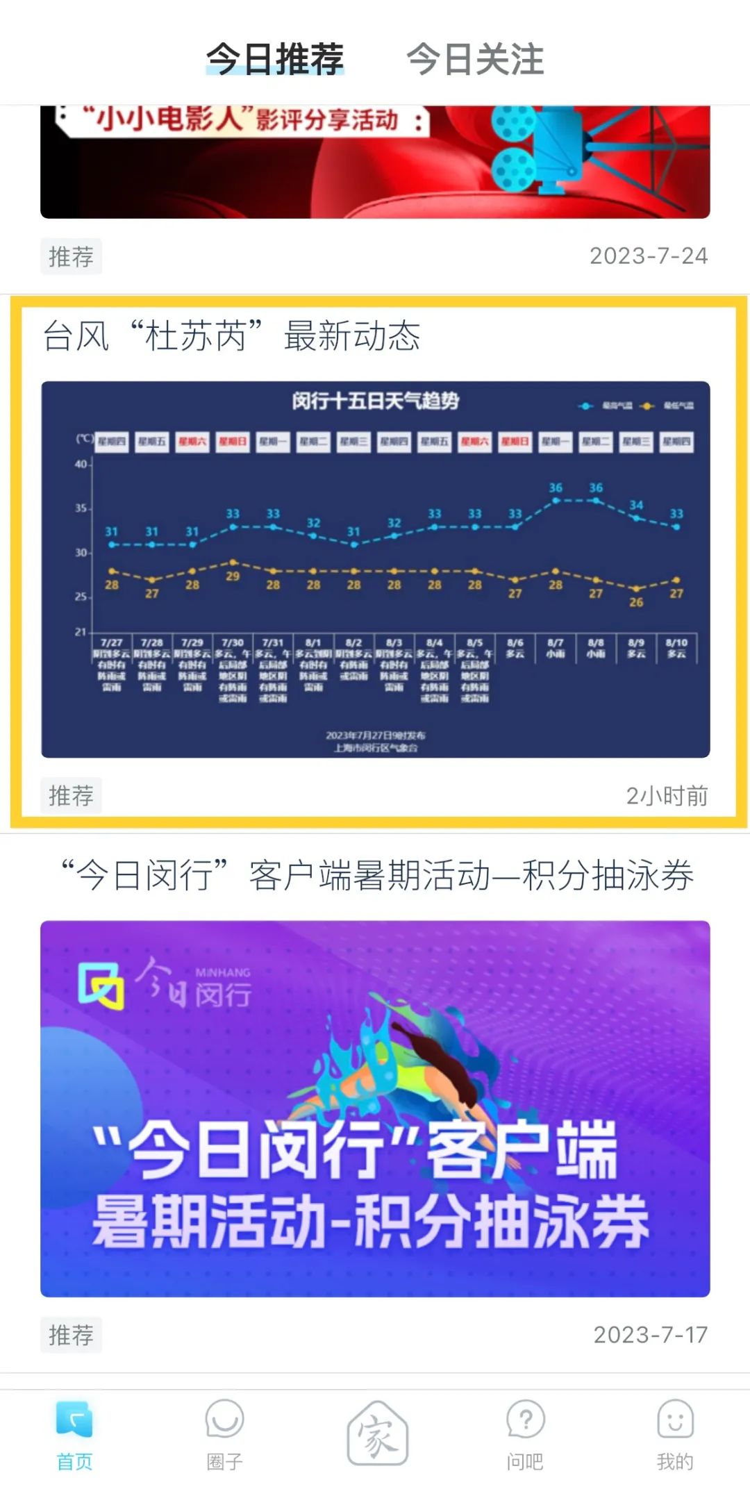 在这里,要告诉大家一个好消息,“今日闵行”近期开辟了新版块。即日起,小伙伴们如果想要了解更多台风信息,就可以打开我们“今日闵行”客户端,点击首页的黄色方框区域,就可以轻松了解到实时更新的台风信息和闵行区十五日天气预报啦!