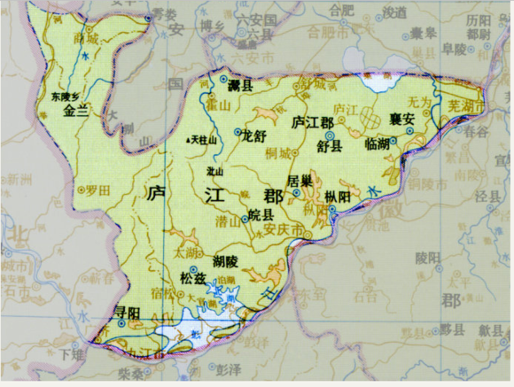 这里需要交代的是,安徽境内,古灊县位于今霍山县(上元街村),东晋孝武年间(373~396)为庐江郡治。南朝宋时,撤龙舒县并入舒县,改治今舒城县城关镇。因庐江郡治于灊县交通不便,一度迁址舒县。后又因舒县城不便隐蔽,便将灊县迁往今庐江县境设置,兼庐江郡治。《路史》(南宋·罗泌著):“庐江南二里有灊城,即灊所迁居,今庐江之灊也。”