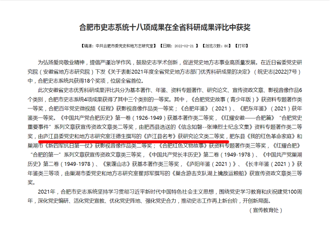 日前,“2021年度全省党史和地方志部门优秀科研成果奖”评选揭晓:《庐江县名考》荣获“研究论文”类二等奖。