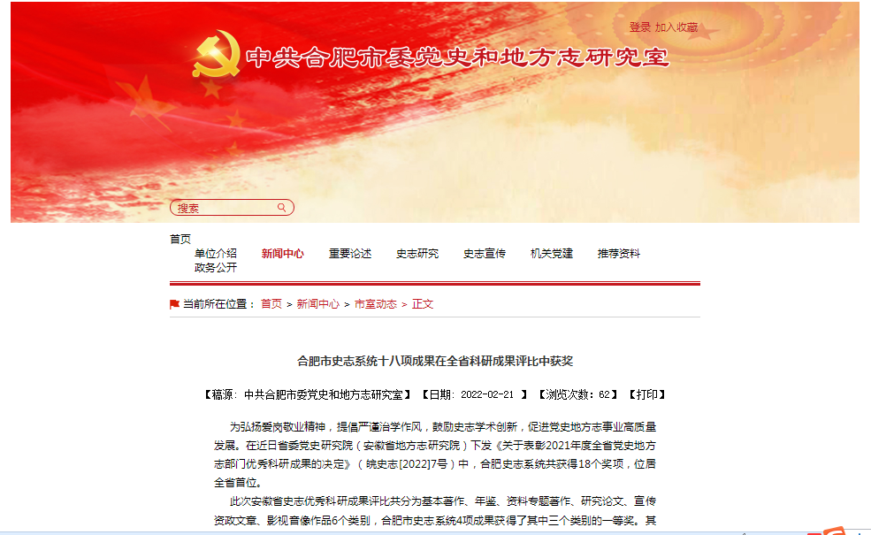据悉,安徽省“史志优秀科研成果”评比共分为基本著作、年鉴、资料专题著作、研究论文、宣传资政文章、影视音像作品6个类别,合肥市史志系统2021年度共获得18个奖项,位居全省首位。其中,研究论文类获奖作品仅有《庐江县名考》一篇(全省共10篇)。