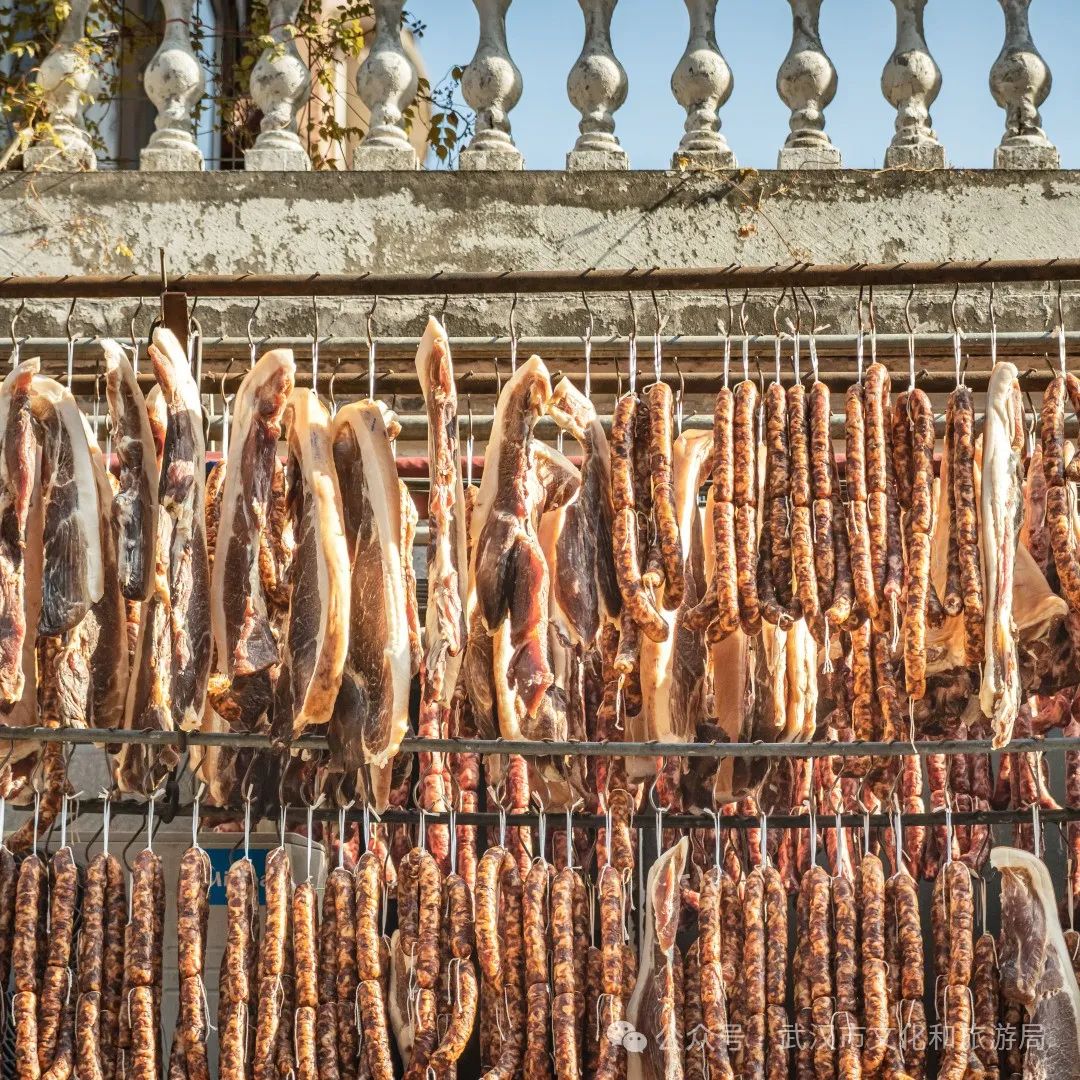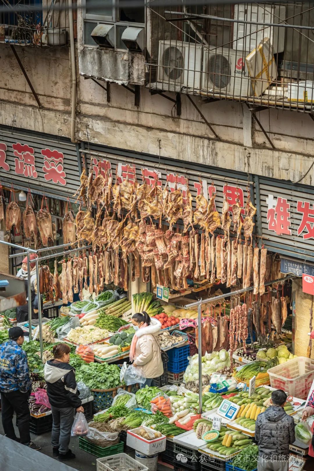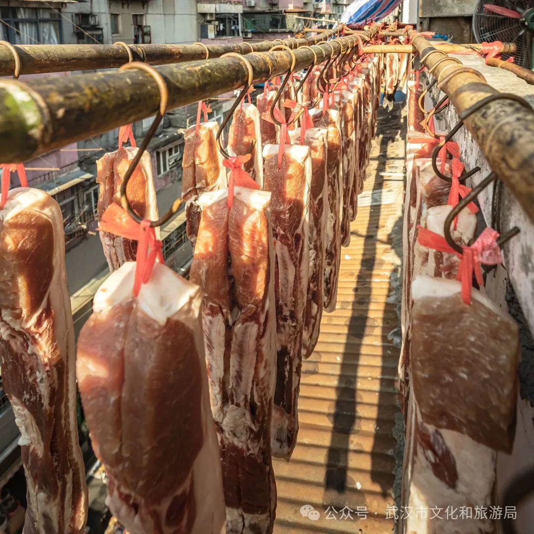 「天声街」,就是武汉菜场里的烟火气icon,有人称它“5A级”菜市场。246米的短街,有10余家腊肉铺子,阳台长满了腊货。